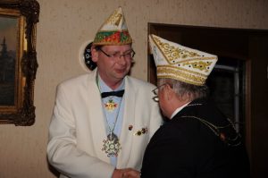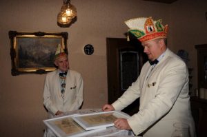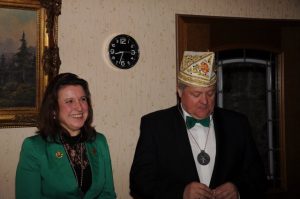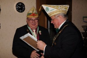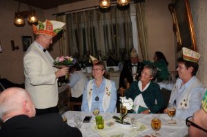 Aber der Reihe nach. Knapp 30 Mitglieder, Ehrenmitglieder, Ehrensenatoren und der Ehrenpräsident waren eingeladen, um mit dem Vorstand den diesjährigen Ehrenabend zu feiern. Leider gab es einige terminbedingte Absagen sowie fünf kurzfristige Absagen aufgrund von Erkältungen oder ähnlichem. Dennoch fanden sich 19 Mitglieder der Gesellschaft und der Präsident des Regionalverbands linksrheinischer Karneval (LRK) Ralf Mühlenberg in charmanter Begleitung seiner Gattin. Speziell für diesen Besuch möchten wir noch einmal ein herzliches Dankeschön aussprechen.