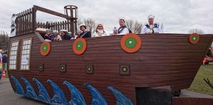 Die Gesellschaft 1938 Krefeld-Oppum e.V. „segelt“ durch den Rosenmontagszug. Dem diesjährigen Motto folgend, „die 38er haben alles im Griff, auf dem Oppumer Narrenschiff“, zieht die Gesellschaft auf einem Schiff den Zugweg entlang.