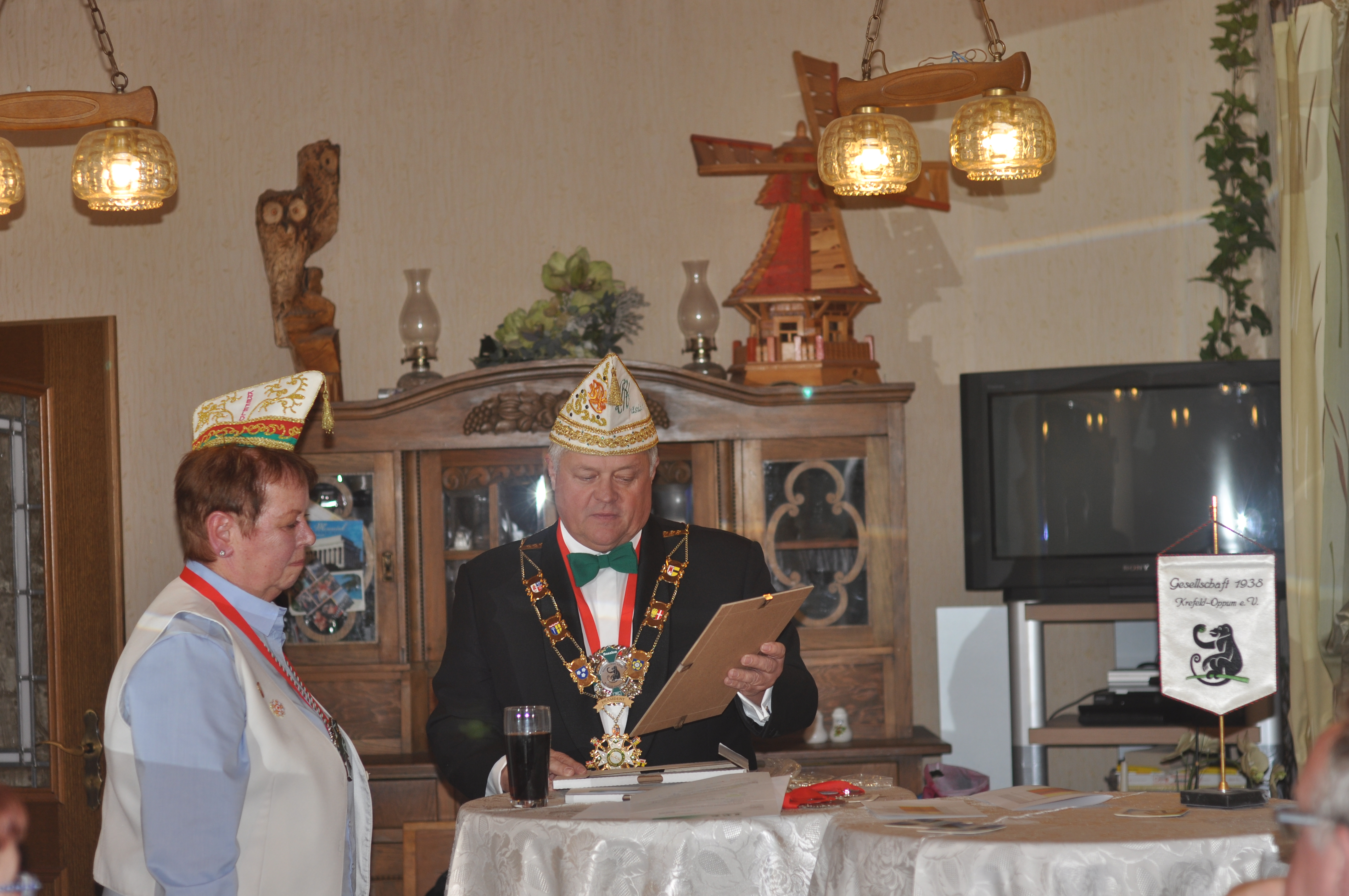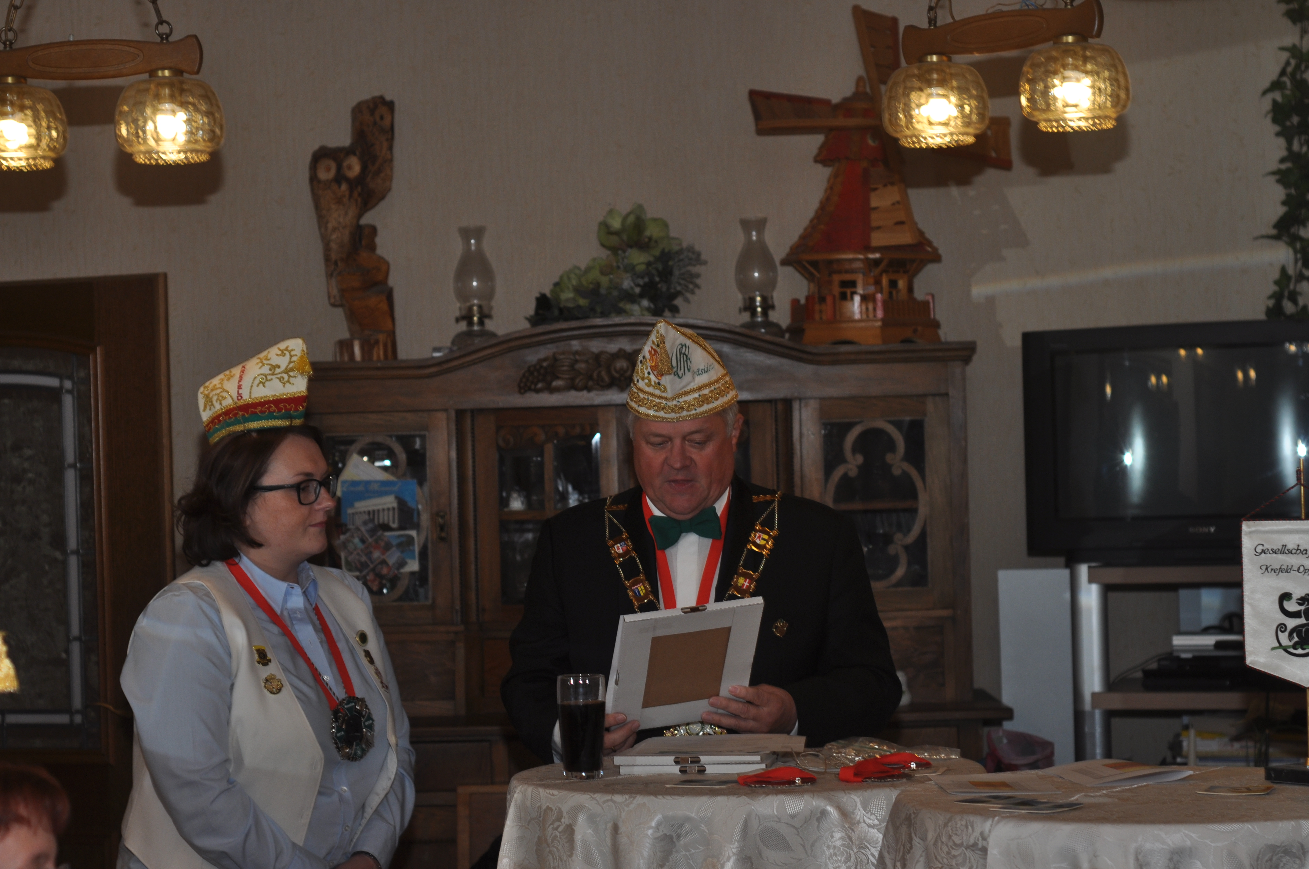 Da wir dieses Jahr mal wieder einen Sessionsorden haben, gab es für Präsident Sascha Rülicke sehr viel zu tun. Unterstützt von der Schatzmeisterin Nicole Heisters wurden alle anwesenden Mitglieder mit dem Sessionsorden ausgestattet. Begonnen wurde mit den sechs Neumitgliedern.