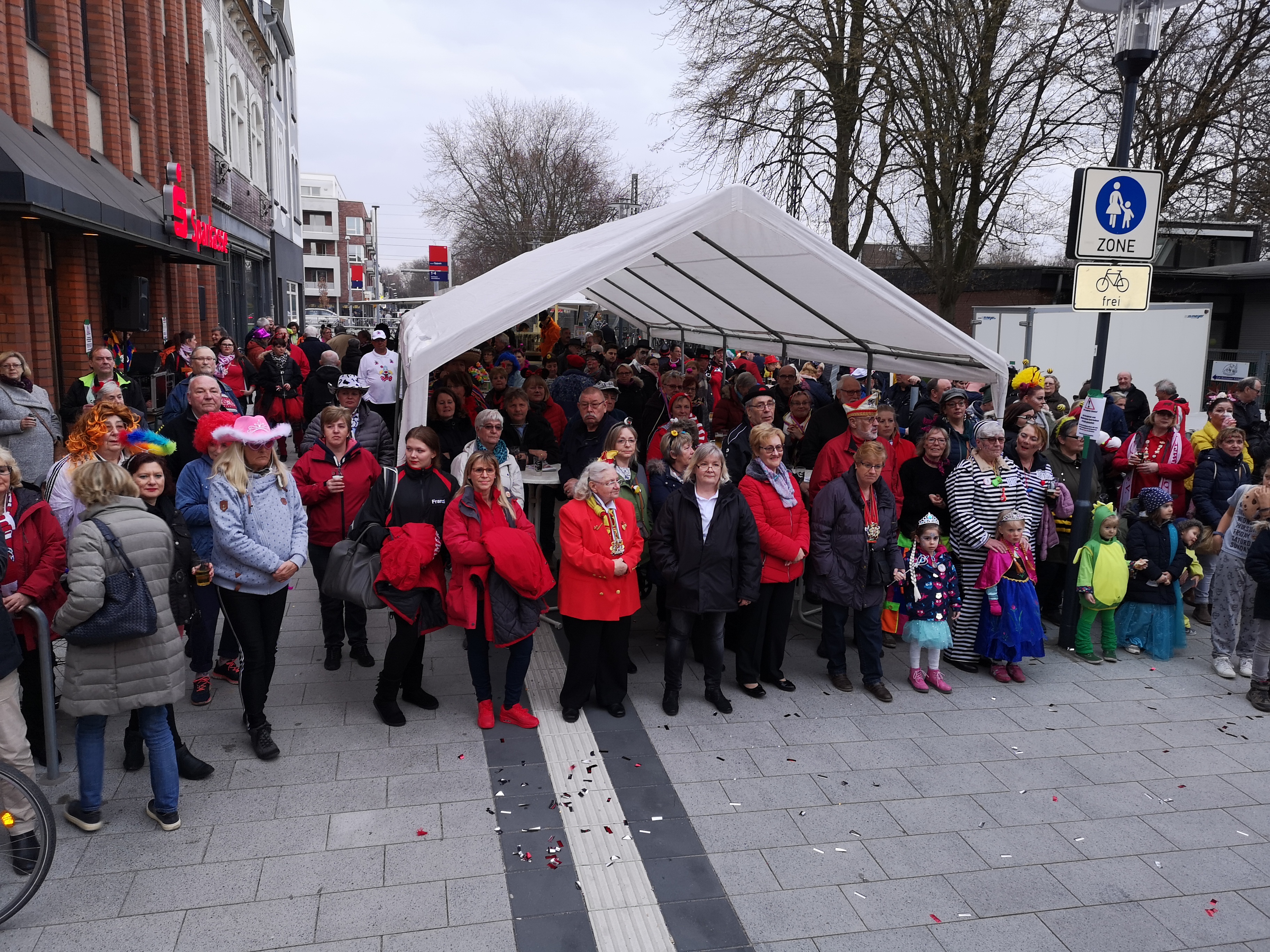 Nach und nach trafen mehr feierfreudige Möhnen, Jecke und Karnevalisten ein, um bei gutem Wetter draußen zu schunkeln, zu singen und zu feiern. Bei guter Stimmung eröffnete Präsident Sascha Rülicke das offizielle Treiben vor der Sparkasse.