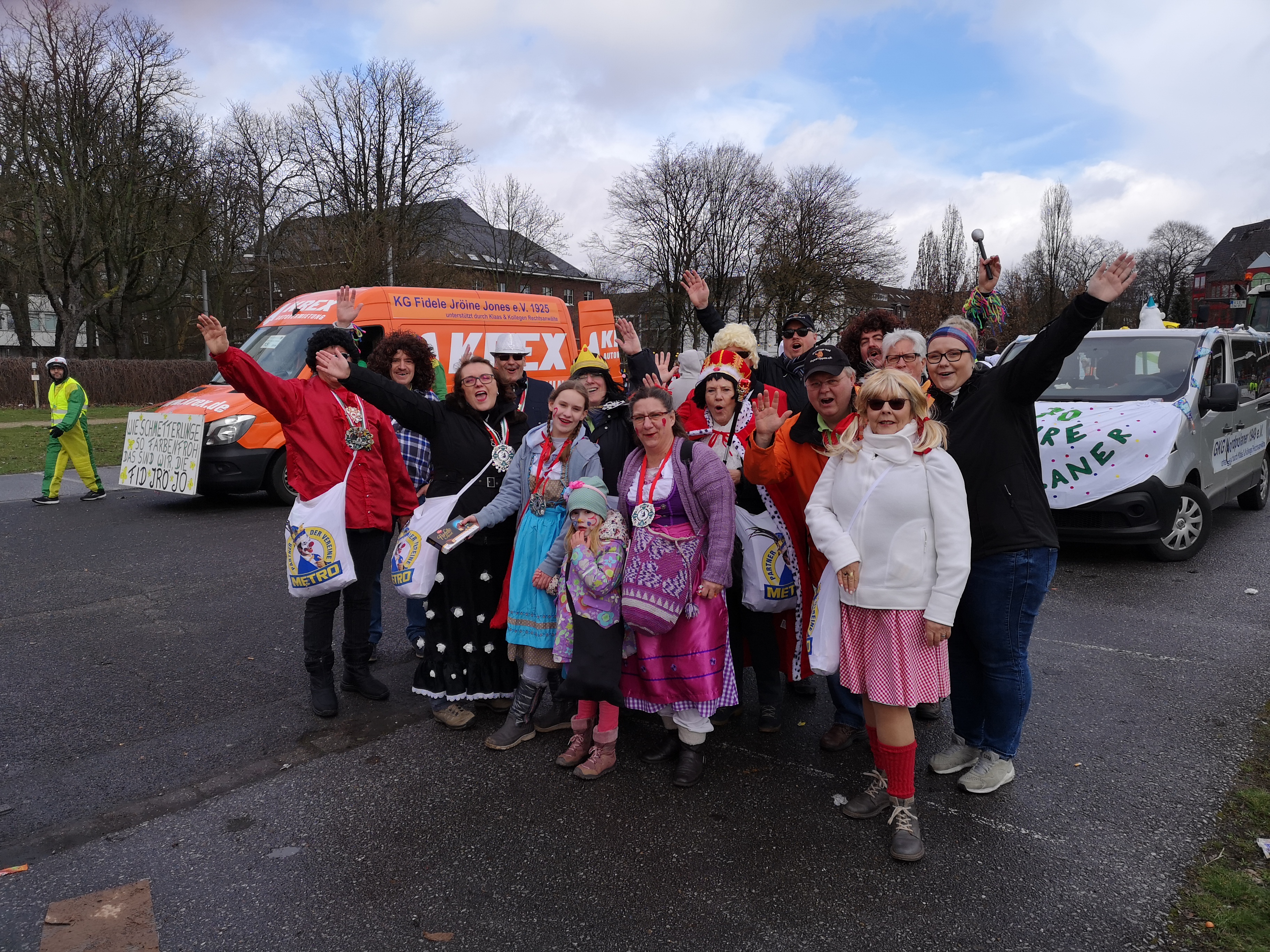 Mit etwa 20 angemeldeten Teilnehmer*innen wollten wir in den Zug starten. Krankheits- und wetterbedingt waren letztlich 16 zumeist große 38er und unsere Radengel am Start. Gegen 12.15 Uhr hatte es noch einmal ordentlich geschauert, doch bei der Aufstellung keimte erste Hoffnung auf, einen nicht zu windigen, vor allem aber trockenen Rosenmontagszug im Sonnenschein erleben zu können.