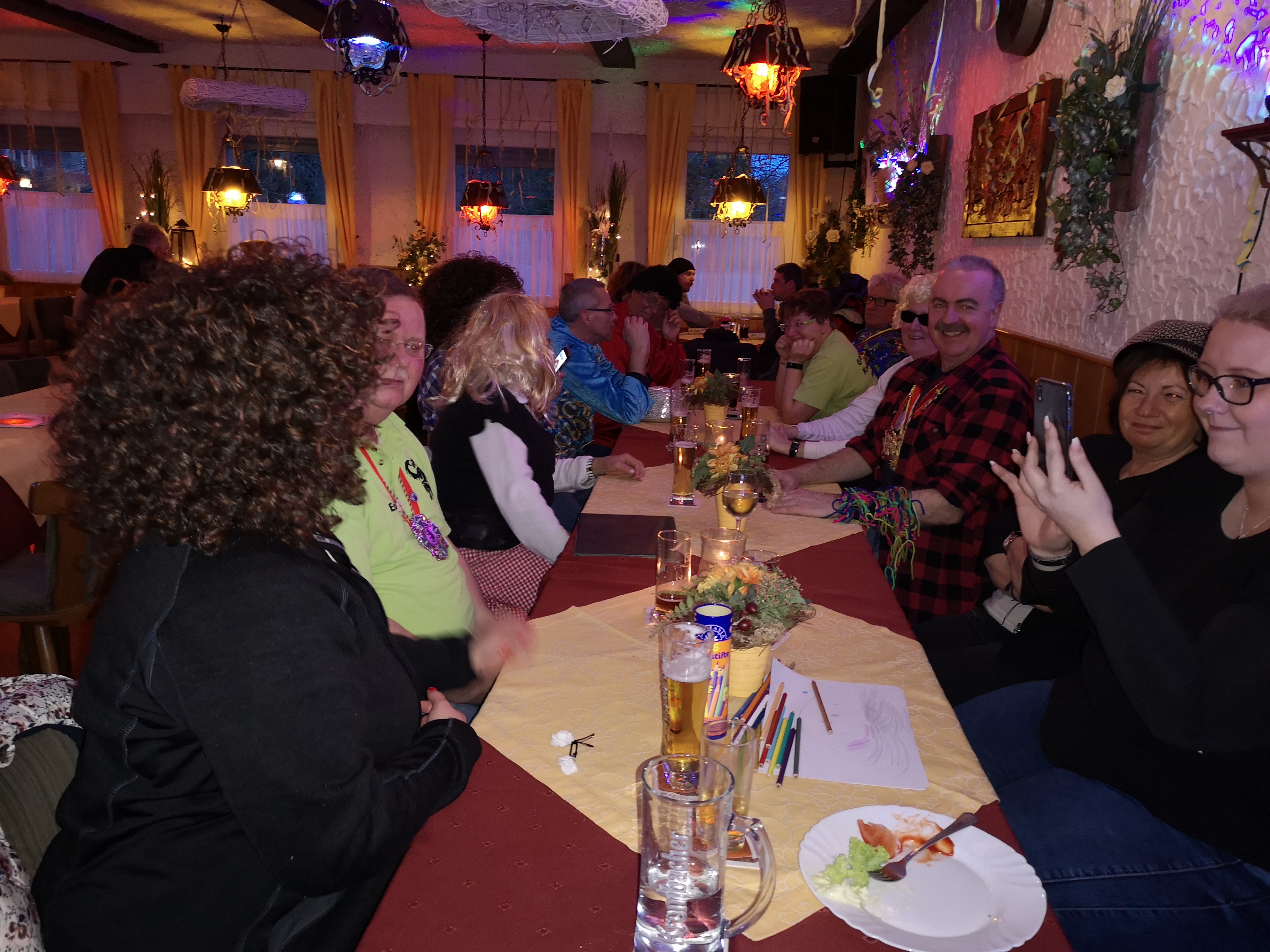 Traditionell wird nach der Teilnahme in einem Karnevalszug im Vereinslokal „Zum Hochfeld“ Erbsensuppe gegessen. Hier waren noch fast alle Zugteilnehmer dabei. Es wurde natürlich gelacht und Anekdoten von früheren Zügen erzählt.