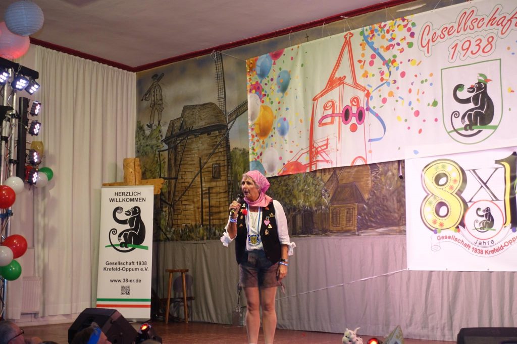 Ein besonderes Merkmal der 38er ist die enge Verbundenheit zum Verein. Folglich bewies Beate dies, Vereinsmitglied und Ex-Prinzessin von Krefeld, die mit ihrer Büttenrede den jecken Ton des Abends traf und für einige Lacher sorgte.